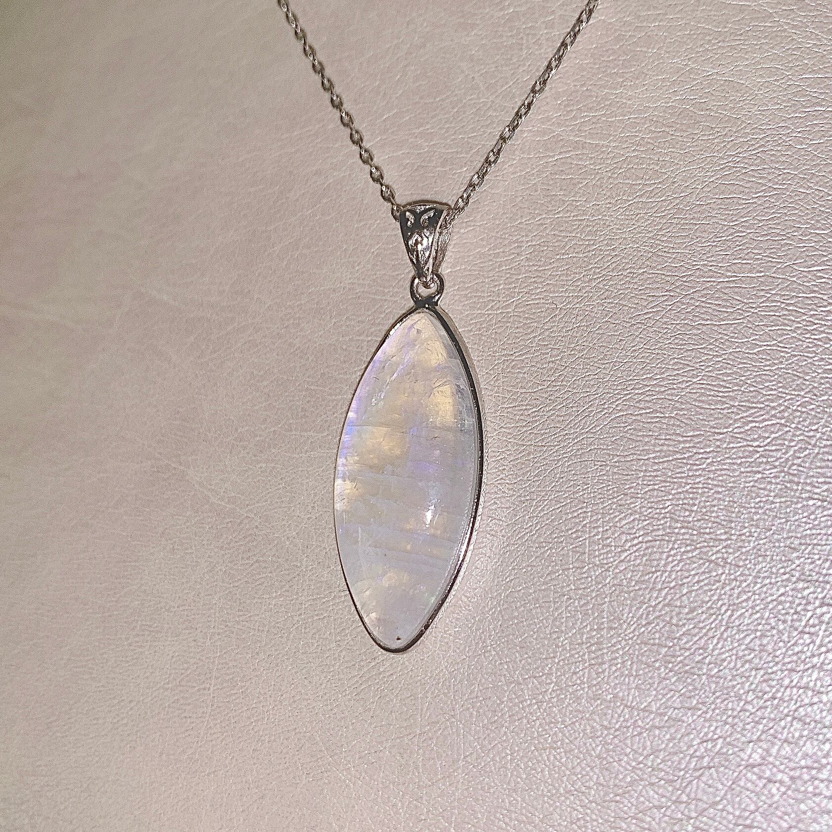 アーモンド型のレインボームーンストーンの silver925加工のペンダントトップです。