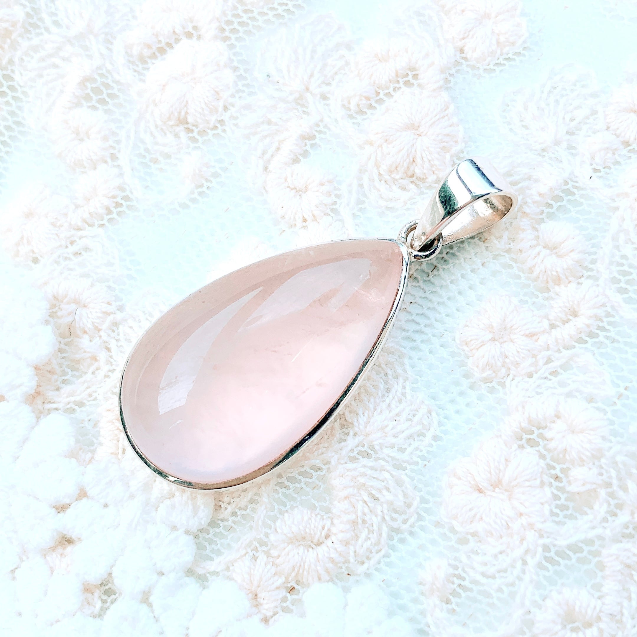 可愛いピンクのカラーが、優しく、ぷるんと瑞々しい印象のとても美しいローズクォーツのペンダントトップです。ハートの位置につけることで、よりエネルギーがハートチャクラに浸透し、サポートしてくれるでしょう。