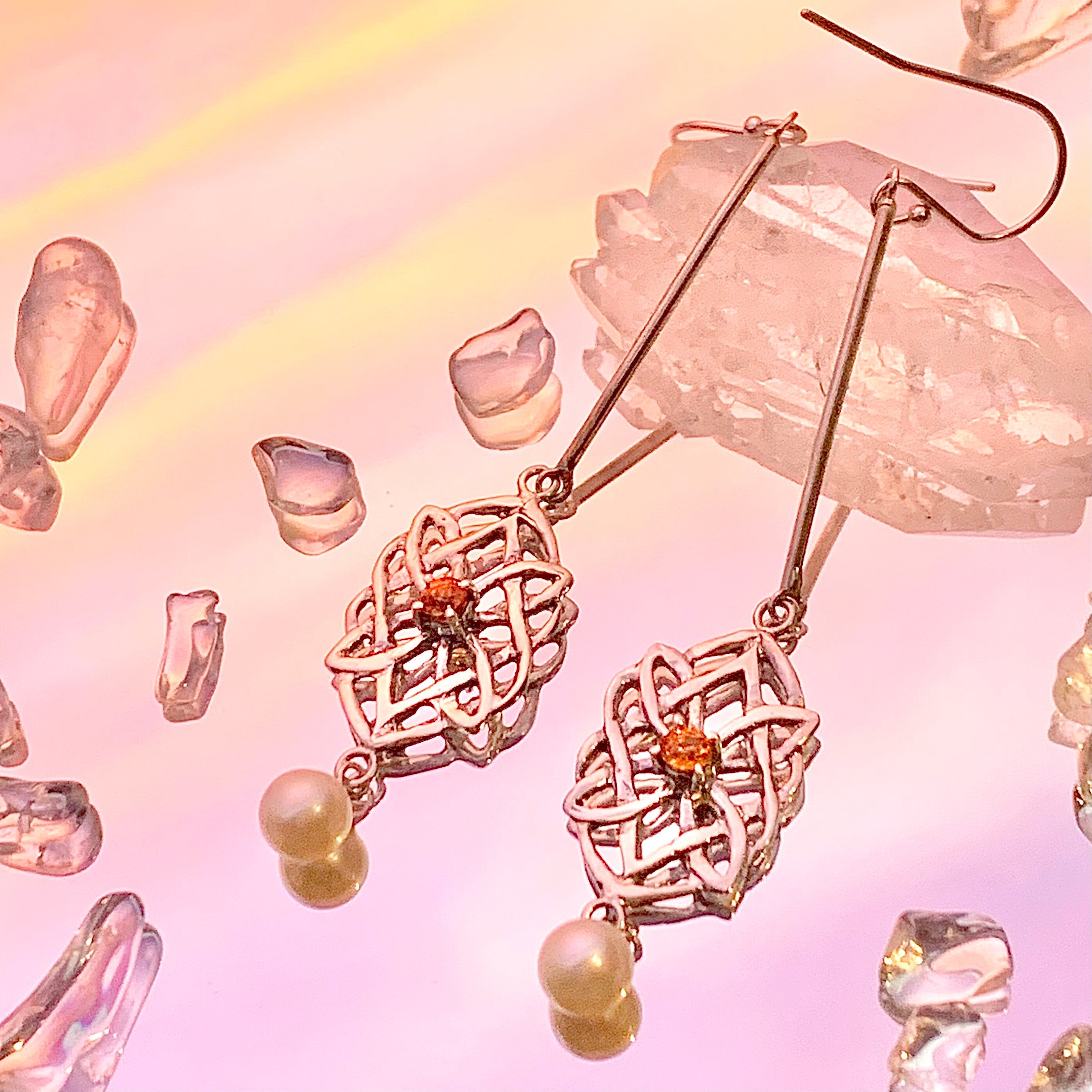 このキラキラと輝く Cosmic Flower✴︎オレンジサファイアピアスは、天空からの祝福を受けるかのような輝きをあなたに届けます。シルバー925製のワイヤーが揺れるたびに、美しいピアスが輝きます。一点一点、丁寧に手作業で仕上げた花のデザインは、あなたの耳元を華やかに彩ります